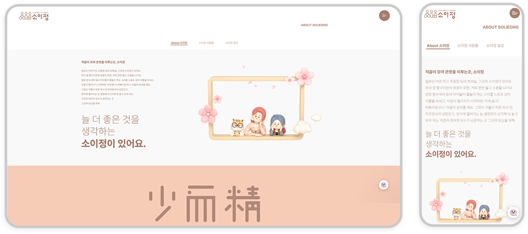 하나의 화면(1)이 거의 모든 비율의 기기 화면을 커버하는 거예요. 사용 단말 환경에 반응해서 유동적으로 변화하는 것이죠. 어떤 환경에서도 적절한 UI를 보여줄 수 있는 장점이 있어 다양한 단말기가 나오는 현재 상황에 적합한 방식이라 계속해서 증가 추세를 이루고 있답니다. 예시를 확인하면 더욱 빠르게 파악이 되실 거 같아 소이정에서 제작한 사이트를 예시로 보여드릴게요!