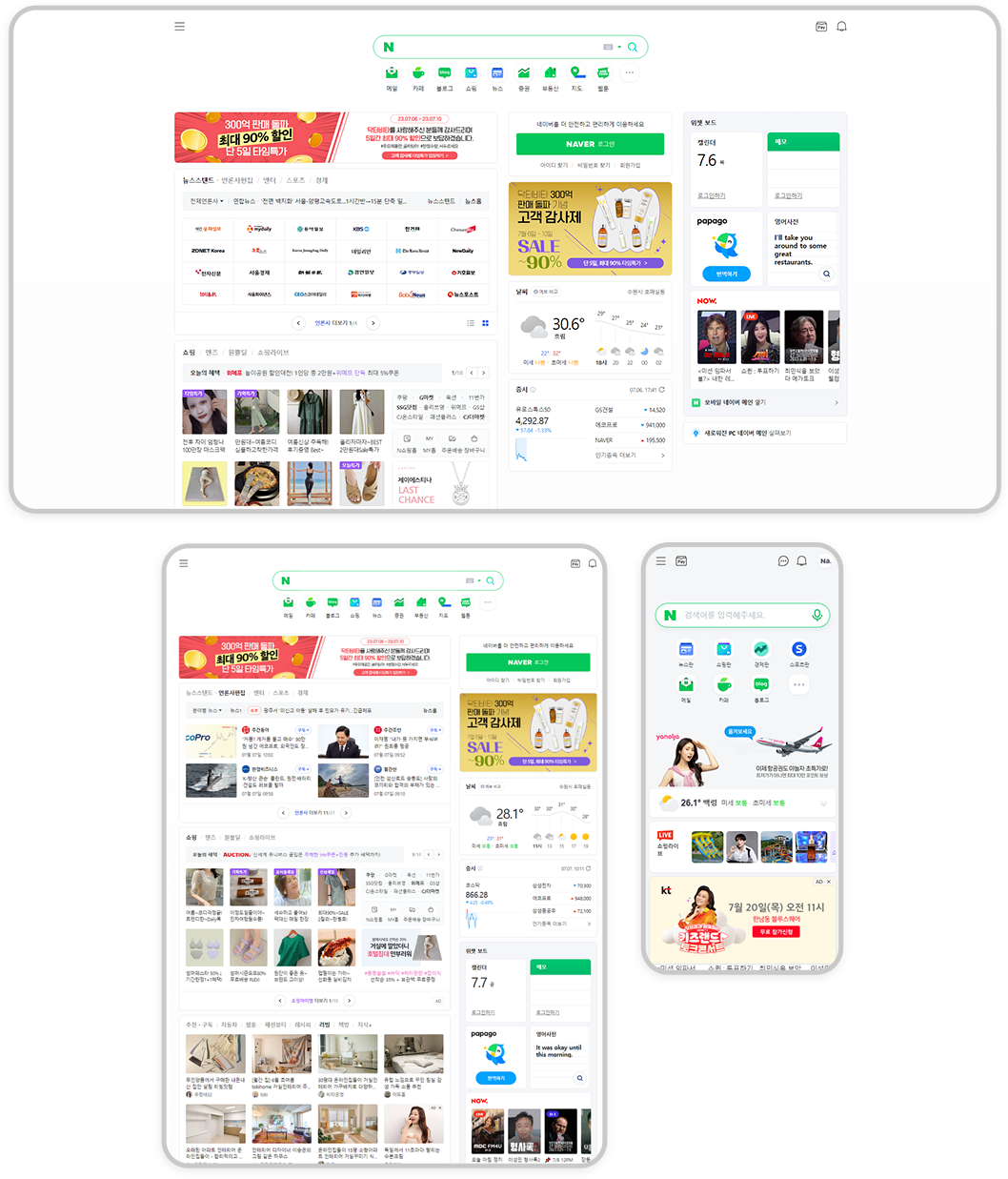 그런데,, 웹페이지를 여기저기 둘러보다 보면 반응형 웹으로 보이는 웹페이지도 있지만 그렇지 않은 경우도 있는데요. 바로바로 우리가 많이 사용하는 네이버! 저는 네이버가 기본 인터넷 화면일 정도로 자주 사용하는데요. 반응형이 아니었다니 ..!! 네이버의 메인 화면이 PC, 태블릿, 핸드폰일 때 어떻게 보이는지 한 번 보여드릴게요! PC 화면과 태블릿 화면은 비슷한데, 모바일 화면은 조금 다르게 보이죠?