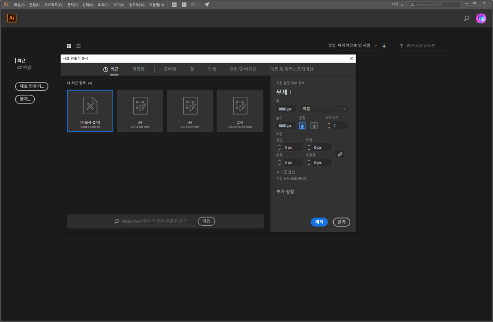 일러스트를 켜고 새프로젝트를 생성해볼게요. 마찬가지로 사이즈는 여러분의 자유! 연습용이니까요~