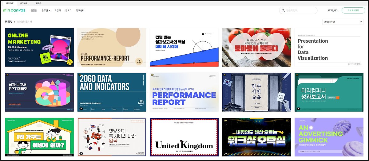 미리캔버스에서 사용중인 이미지등의 디자인 요소들은 모두 라이센스 계약을 통해 제공한다는 점도 큰 장점입니다. 상황별로 사용되면 좋은 PPT템플릿도 추천해주고 있어 편리하게 사용이 가능합니다.