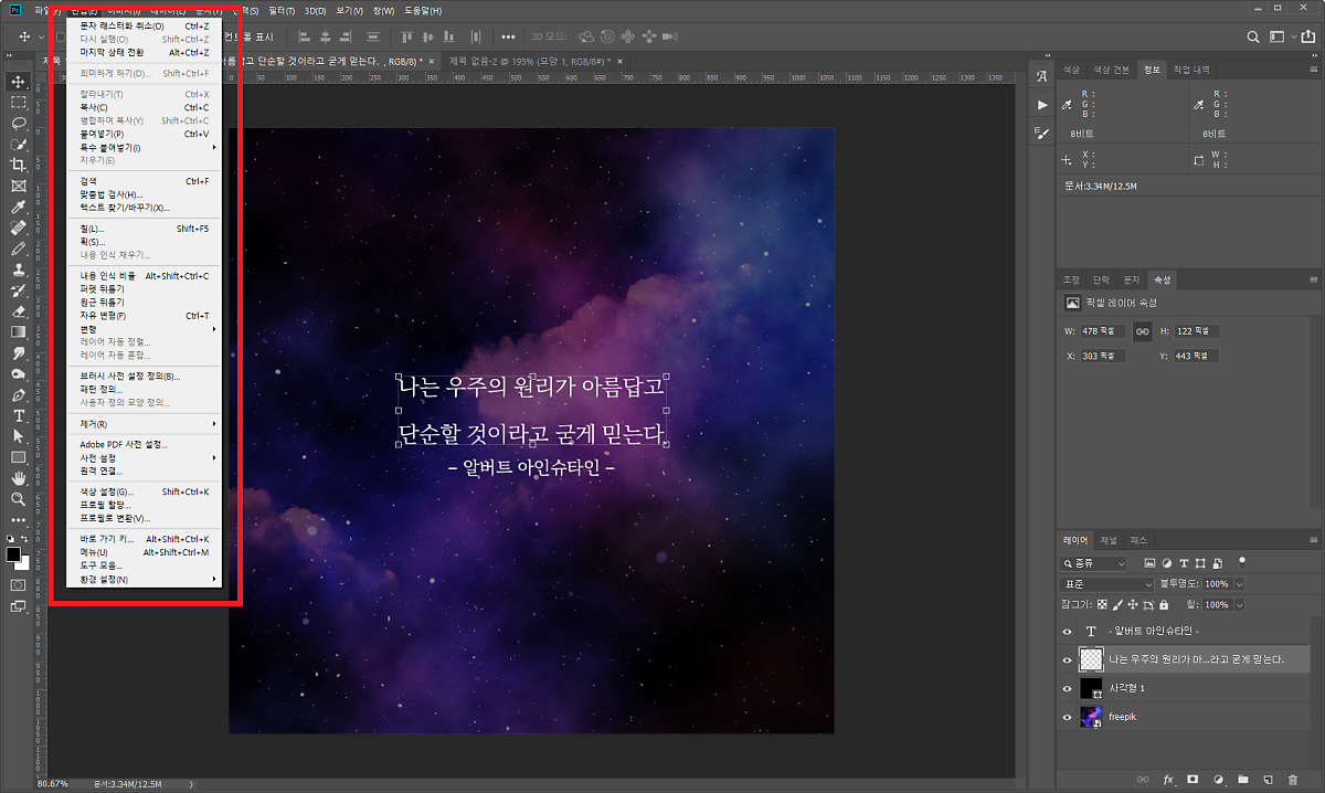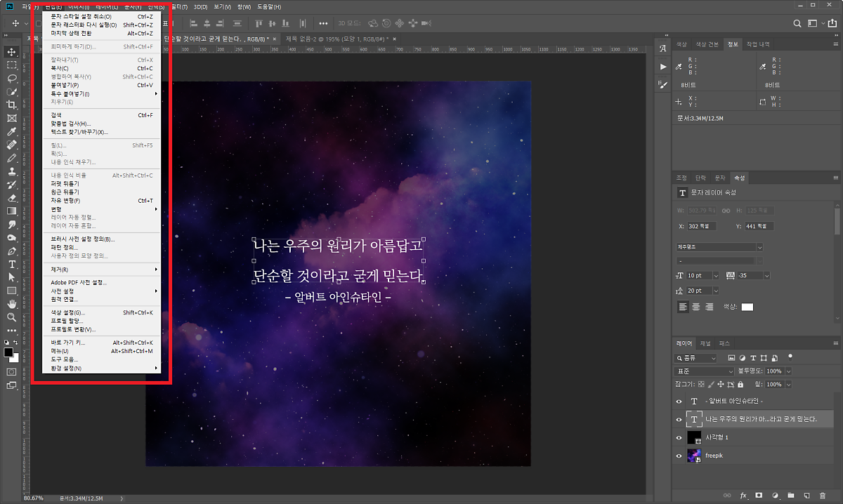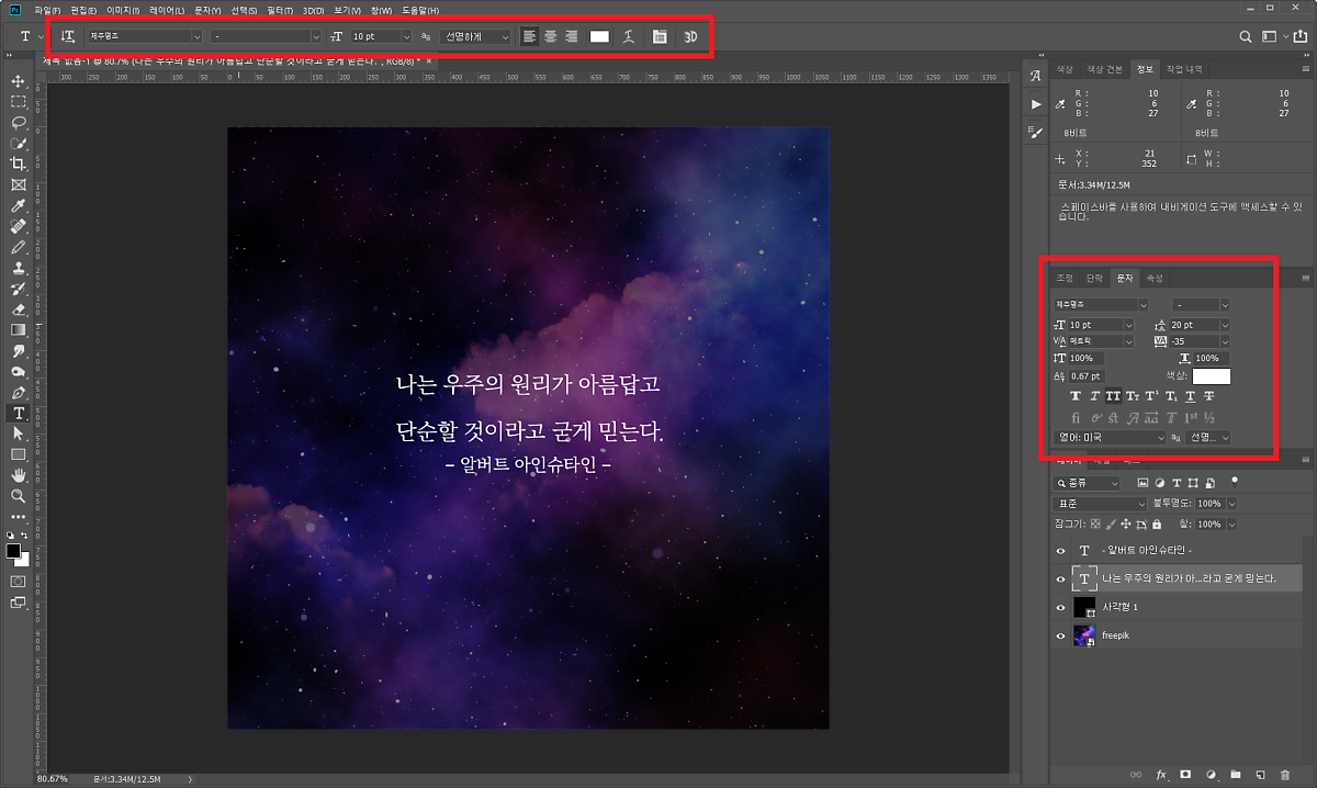 텍스트를 입력합니다. 저는 우주 관련 이미지를 가져왔기 때문에 우주 관련 명언을 함께 준비해서 작성했어요.