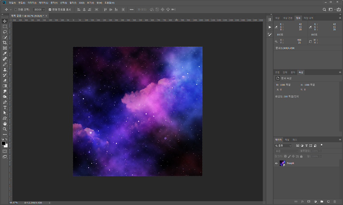 제일 먼저 포토샵을 켜고 새프로젝트를 생성해줍니다. 크기는 상관없으며, 저는 오늘 배경으로 가져온 이미지가 1080*1080사이즈라 그에 맞춰서 생성해볼게요.