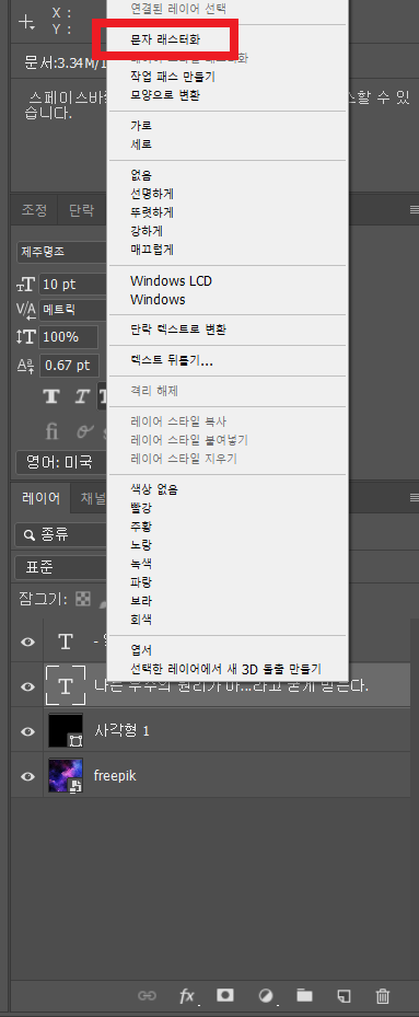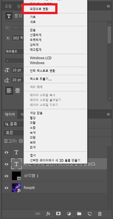 이 밖에 모양으로 변환시키는 방법도 있습니다. 똑같이 텍스트 레이어에 마우스 우클릭을 한 후 이번엔 모양으로 변환을 클릭해줍니다.