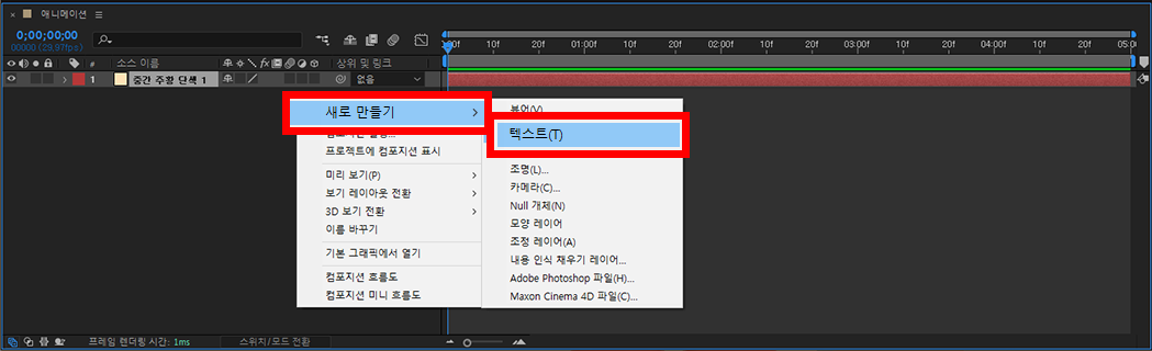 자, 이제 애니메이션 효과를 입혀줄 텍스트를 써야 하는데요. 텍스트 레이어 만들기도 단색 레이어 만들 때와 마찬가지로 레이어 패널에서 마우스 우클릭을 통해 진행하거나, 상단 메뉴바에서 레이어 - 새로 만들기 - 텍스트로 진행하면 됩니다.