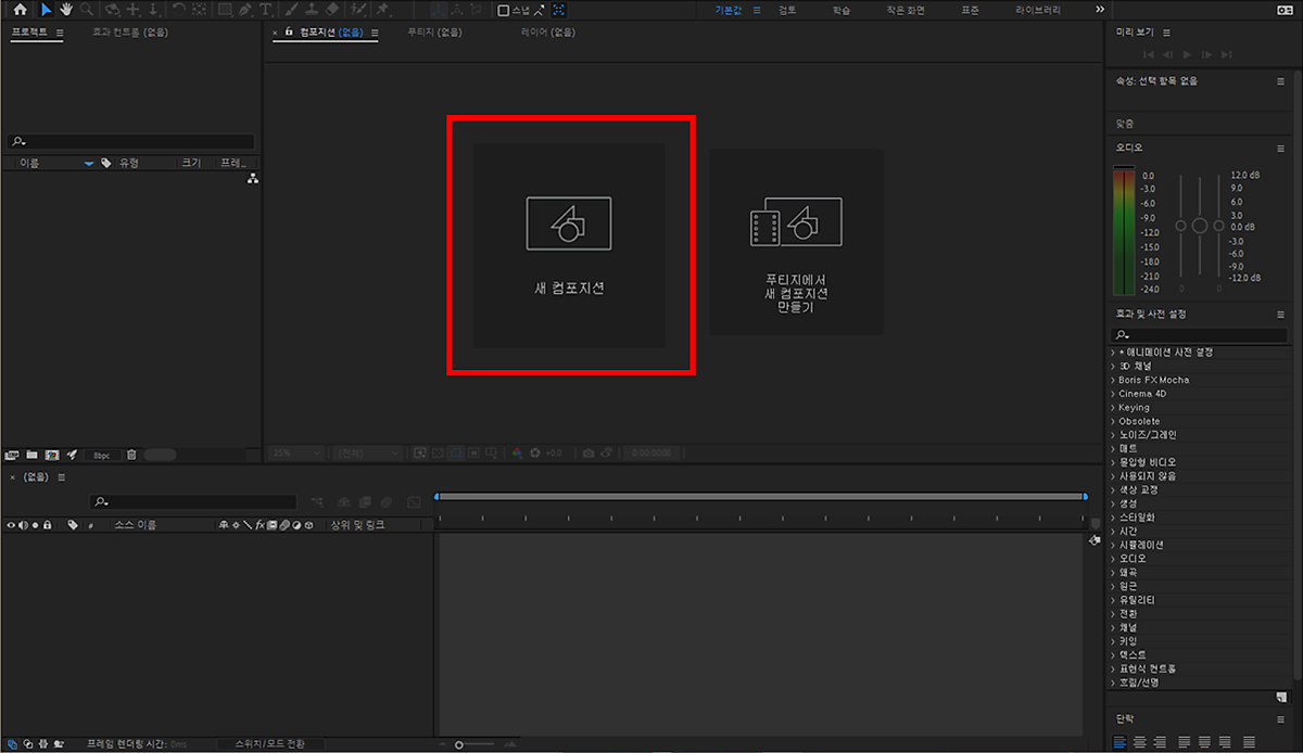 새로운 컴포지션을 만들어줍니다! 새 컴포지션 누르기, Ctrl +N 혹은 프로젝트 패널 우클릭 - 새로운 컴포지션 클릭하기.