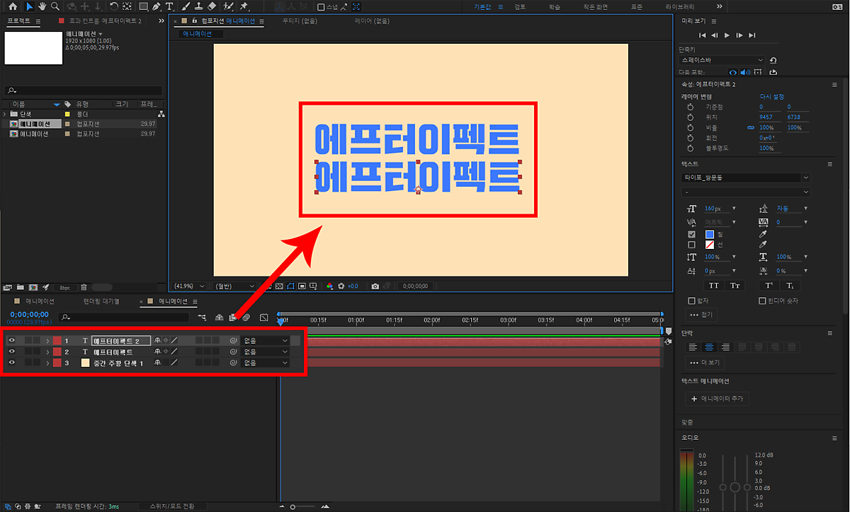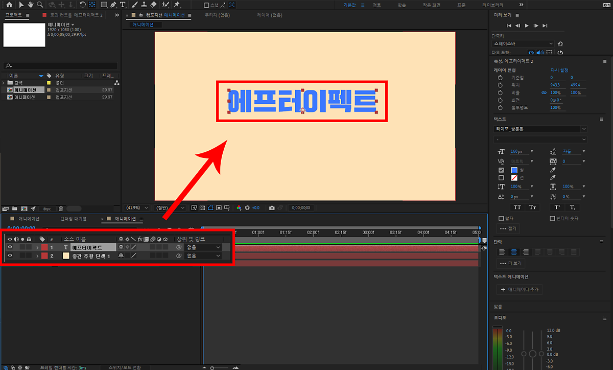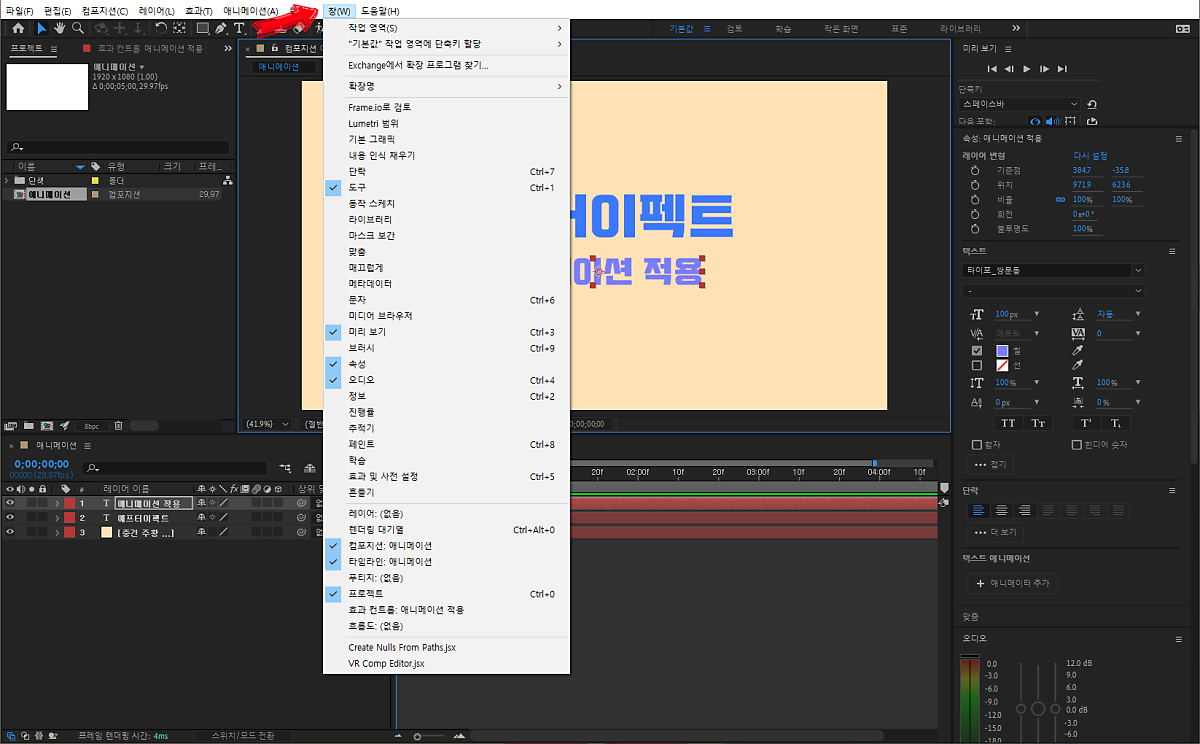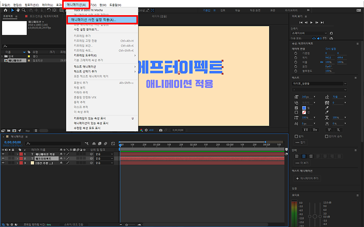 그러고 나서 애니메이션 적용이라는 텍스트도 앞에 수정한 에프터이펙트 텍스트 위치에 맞추어 조절해 줬답니다!