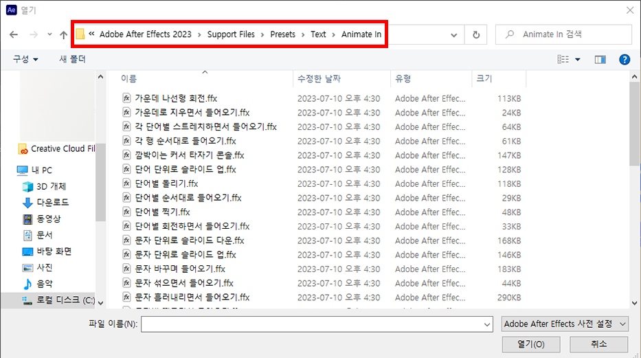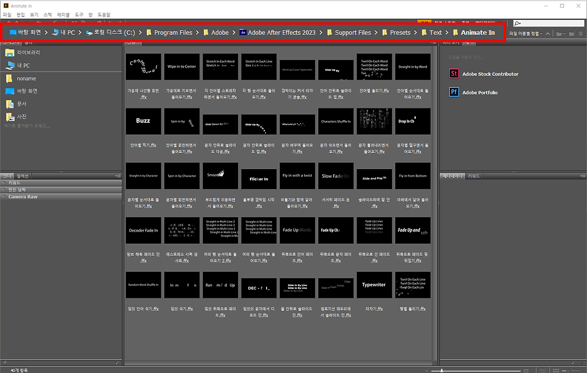 [ 바탕화면 > 내PC > 로컬디스크(C:) > Program Files > Adobe > Adobe After Effects 2023(본인이 깔려있는 에펙버전 파일) > Support Files > Presets > Text > Animate In ]