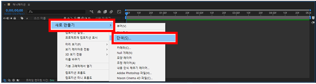 컴포지션의 종이 같은 역할을 하는 것이 단색 레이어인데요. 단색 레이어를 생성하는 방법은 두 가지입니다. 첫 번째는 레이어 패널에서 마우스 우측 클릭을 하고 새로 만들기 - 단색을 클릭하여 단색 레이어를 생성하기,