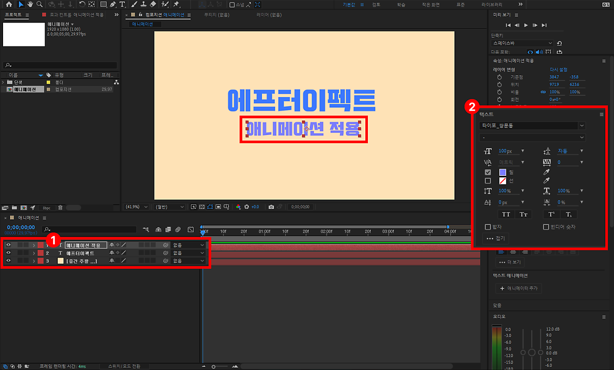 저는 한 줄씩 효과를 넣을 것이기 때문에 아래 에프터이펙트 텍스트를 ①애니메이션 적용이라고 따로 수정해 줬어요. 텍스트 크기와 색도 수정해줬는데요. ②텍스트 패널에서 수정 가능합니다.