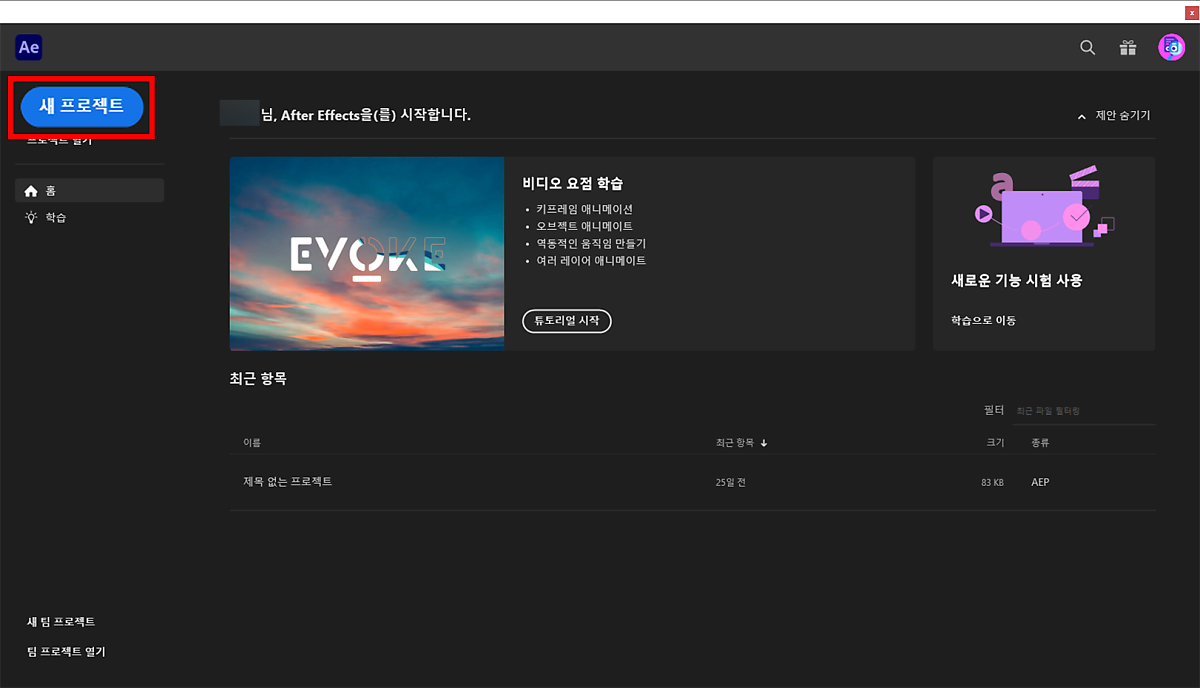에프터이펙트를 켜고 새 프로젝트를 클릭해 줍니다.