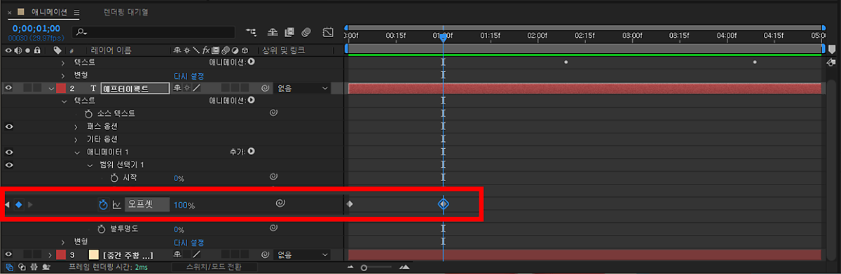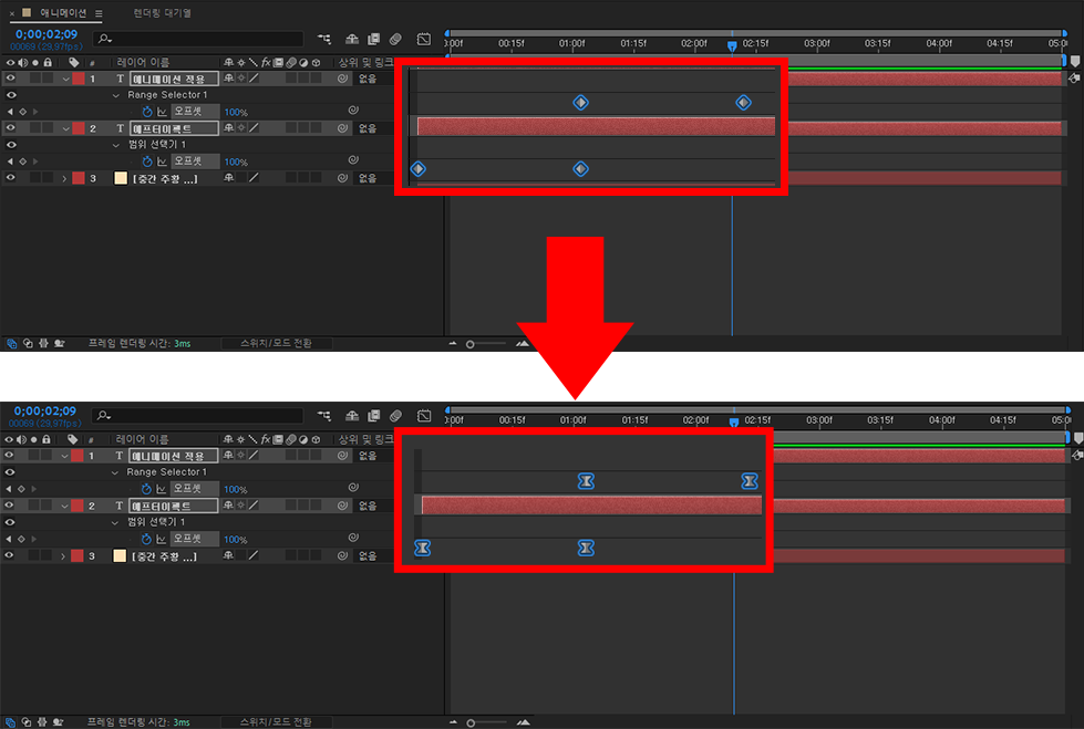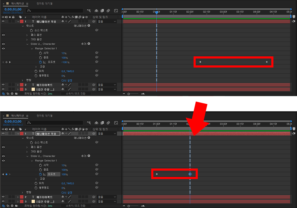 저는 에프터이펙트 글씨가 조금 더 빨리 보였으면 좋겠어서 기존의 마름모 위치를 이동시켜줬답니다!
