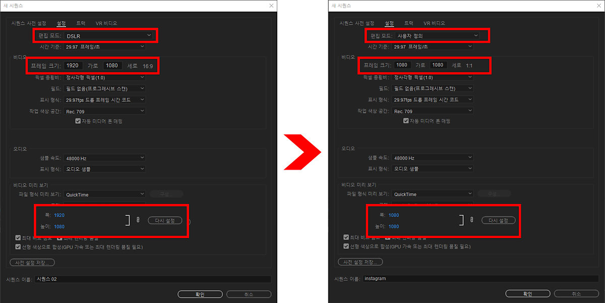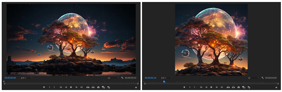 저는 예시로 영상을 가져왔지만, 원하는 정사각형 영상을 만들기 위해서는 앞서 언급했 듯 촬영 시에 먼저 구도를 생각해야 중요한 배경이 잘리지 않아요. 아래 사진을 보면 확실하게 알 수 있는데요. 왼쪽 사진은 시퀀스 설정을 바꾸지 않은 상태(1920*1080)에서 영상을 그대로 가져온 화면이고, 오른쪽 사진은 시퀀스 설정을 변경한 상태(1080*1080)의 화면이에요.