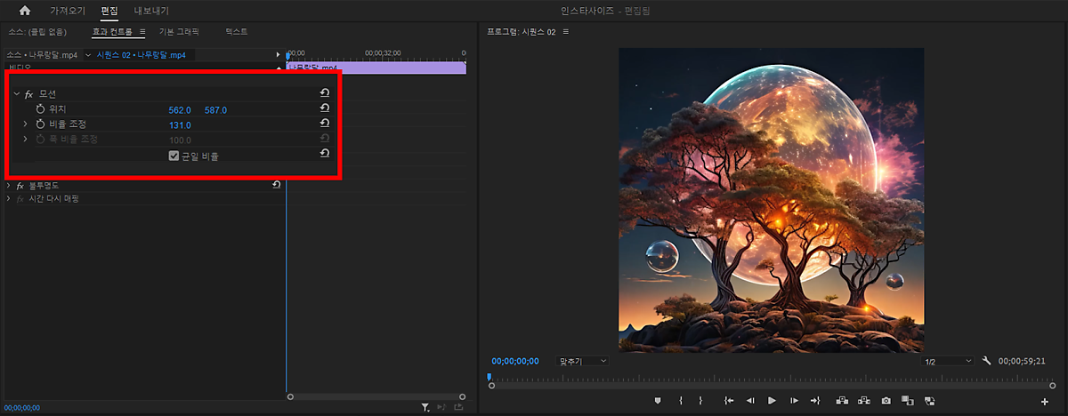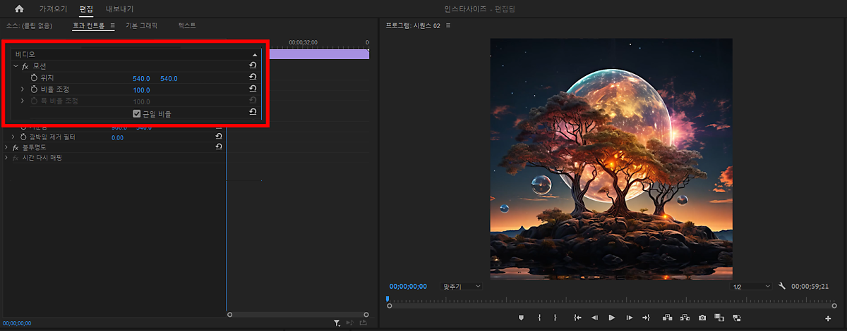 입력되어 있는 수치를 원하는 위치와 비율로 수정한다면! 여러분이 원하는 방향의 영상을 얻을 수 있답니다. 단, 비율을 너무 늘려버리면 화질이 떨어지니 참고해 주세요 :)