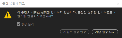 시퀀스와 영상의 프레임크기가 달라서 안내창이 뜨는 거예요. 설정을 바꾸면 시퀀스가 영상 크기로 변경되어버리니 조심해 주세요!