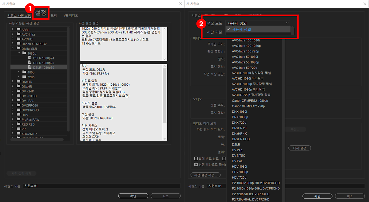 시퀀스 사전 설정 옆에 있는 ①설정탭을 눌러줍니다. 그 후 ②편집모드 셀렉박스를 클릭한 후 사용자 정의로 변경합니다.