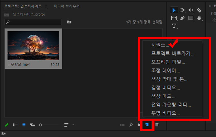 ①아래 접힌 종이 아이콘(새 항목)을 눌러 ②시퀀스를 선택합니다. 원래는 시퀀스 선택 없이 타임라인으로 드래그 & 드랍하여 자동으로 시퀀스가 생성되게끔 했죠. 하지만 오늘은 영상과 시퀀스의 설정이 다르게 적용되어야 하니 수동으로 만들어 볼 거예요!