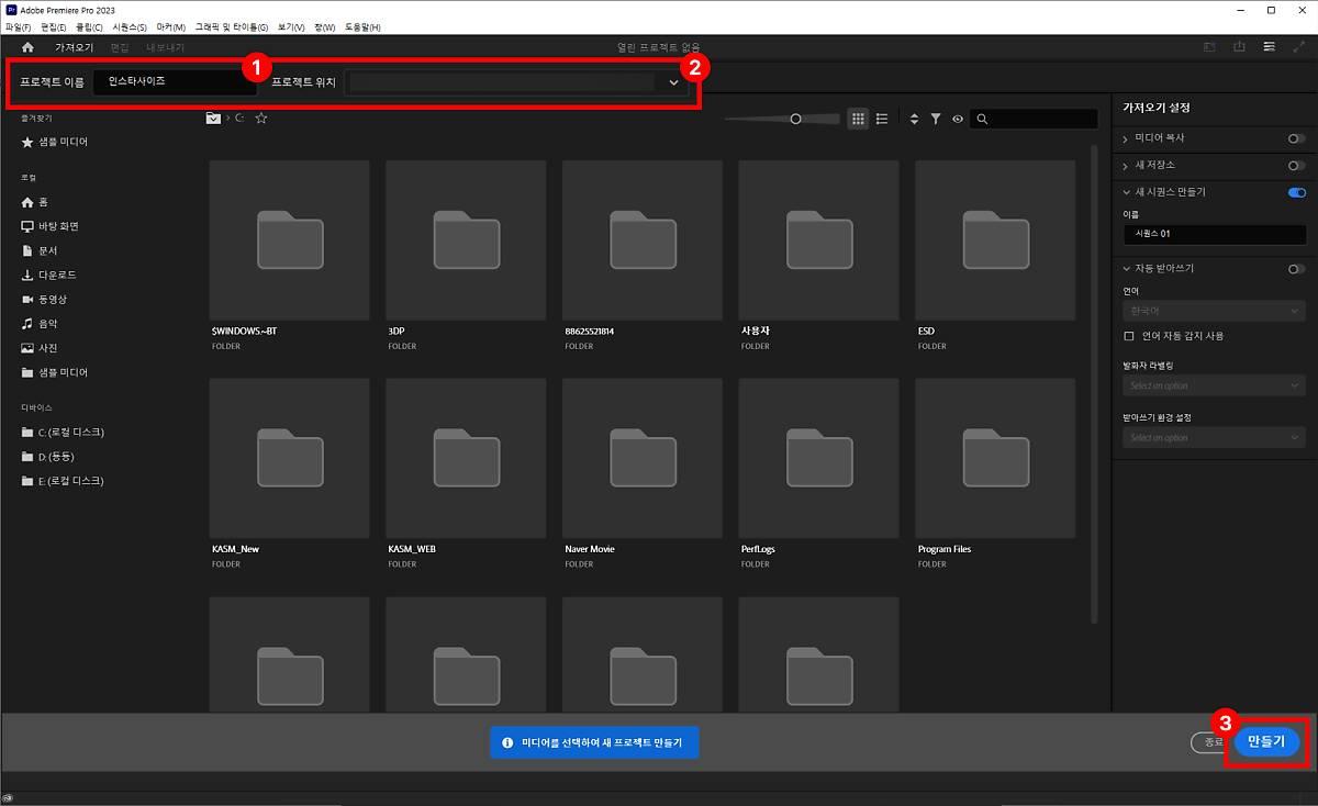 제일 먼저 프리미어를 켜줍니다. ①프로젝트 파일의 이름을 설정하고 ②파일을 저장할 위치도 설정해 준 후 ③만들기를 눌러 프로젝트 생성을 해줍니다.