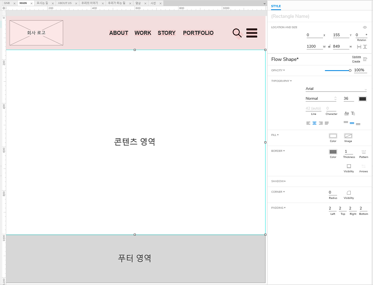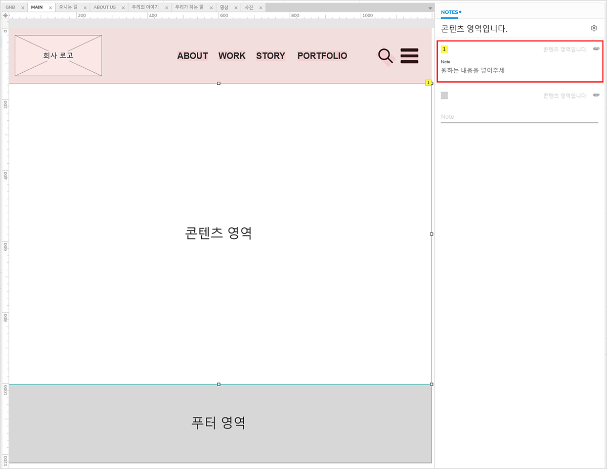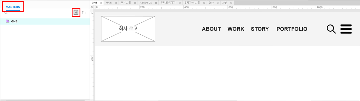 마스터 영역에 GNB 마스터가 생겼죠? 다른 페이지에서 똑같은 GNB를 넣고 싶다면 마스터에 있는 GNB를 설계 영역으로 드롭해 주세요. 페이지별로 작업할 때마다 만들지 않아도 된답니다!