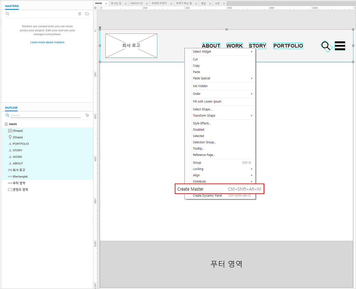 두 번째는 MASTERS에 페이지를 추가 - Create Master - 끝