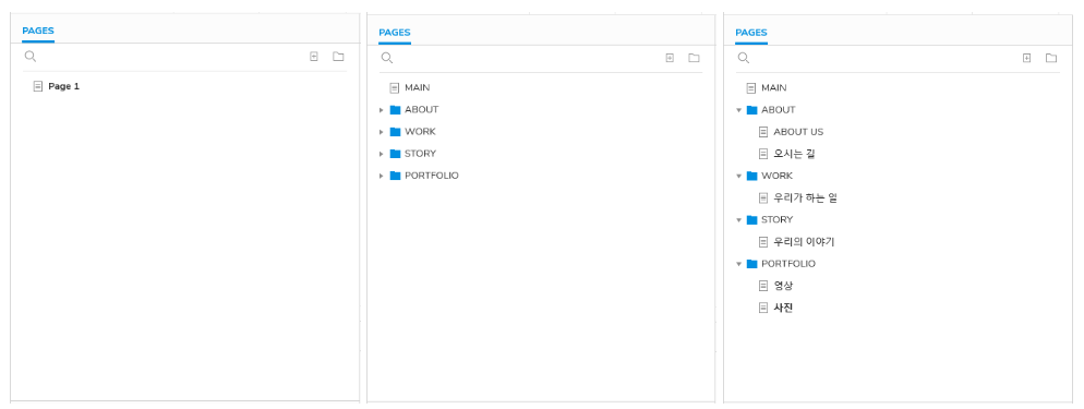 그리고 만들어진 페이지를 누르면 위와 같이 5. 페이지 명에 문서들이 늘어나는 것을 확인하실 수 있습니다. 이제 정리한 사이트맵을 통해 각각의 페이지에 걸맞은 설계를 하시면 됩니다.