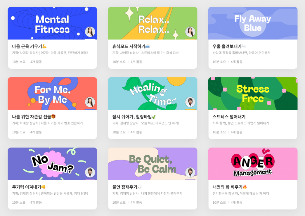 이 외에도 사전/사후 결과지 제공을 통한 상태 점검, 감정을 분석해 주는 단어 분석기 제공, 매 회기마다 집중과 마음 건강을 위한 명상 제공 등 일상 속 마음 건강을 위한 다양한 요소들을 세심하게 챙겨주는 야무진 서비스라고 할 수 있습니다.