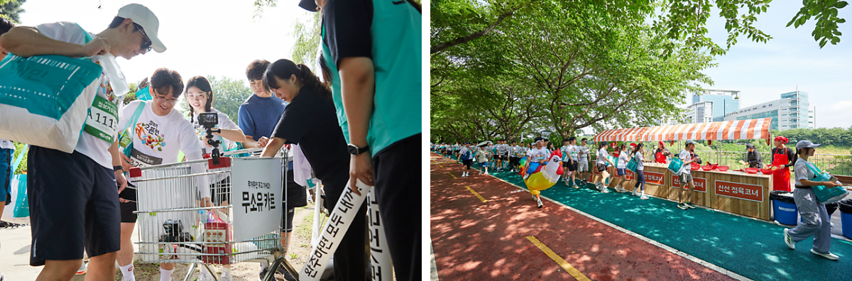 또한 장보기 컨셉에 맞는 디테일들도 참가자들의 재미를 충족시키기에 충분해 보였는데요. 참가자들은 대형마트 시식코너 모양의 급수대에서 에너지를 충전할 수도 있고, 코스 중간중간 무소유 카트에 무거운 장바구니 속 상품을 조금씩 덜어낼 수 있었습니다.