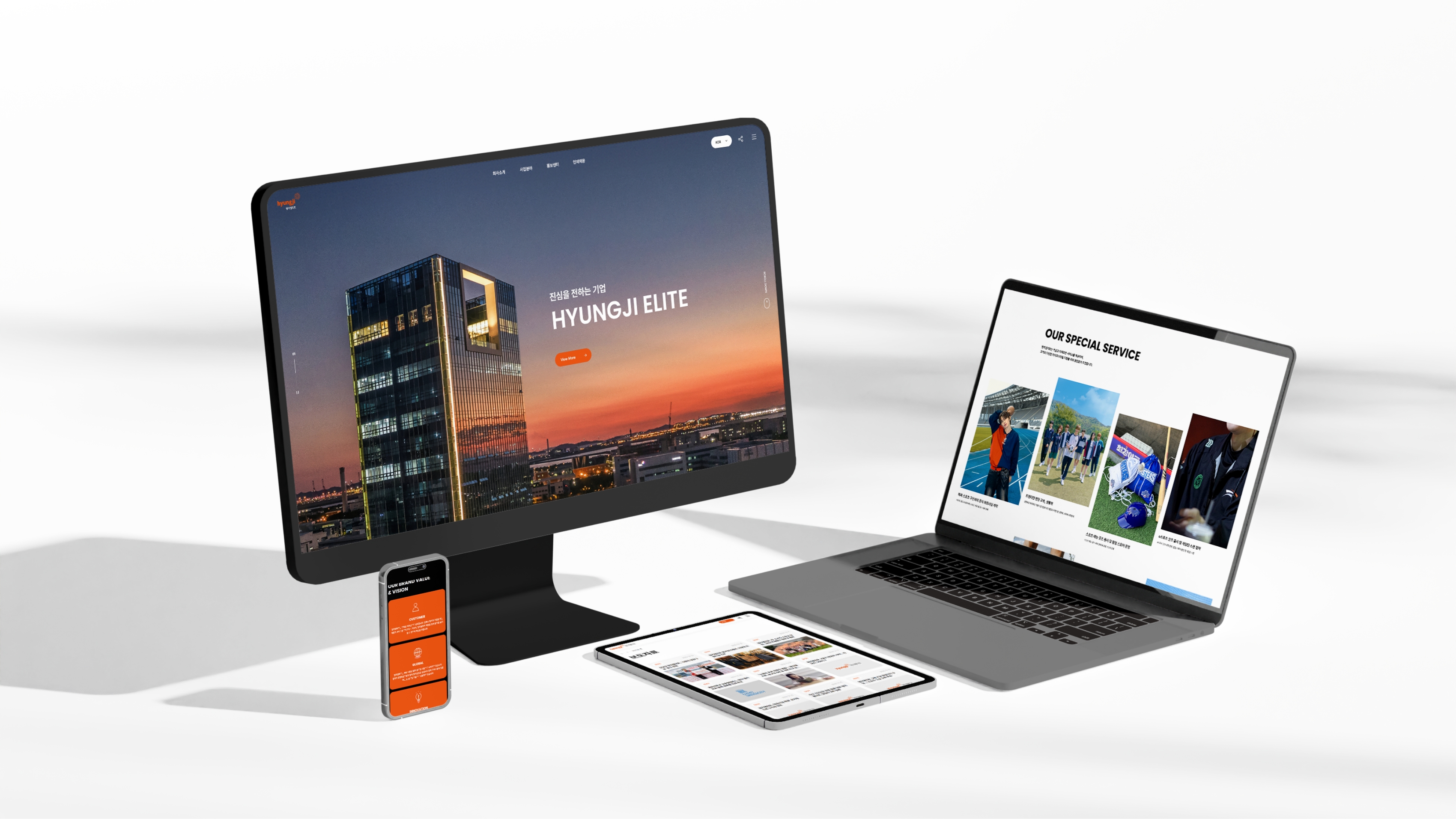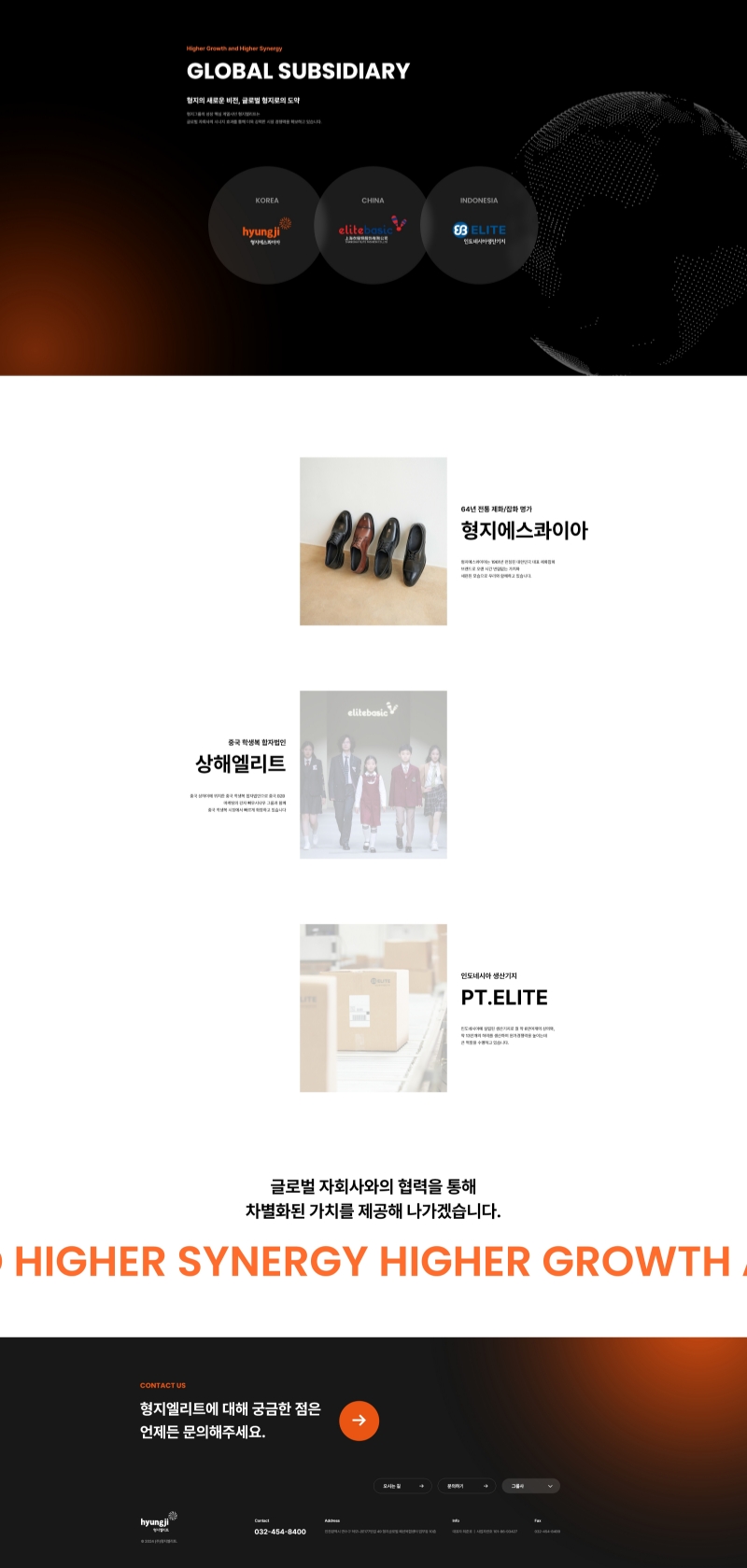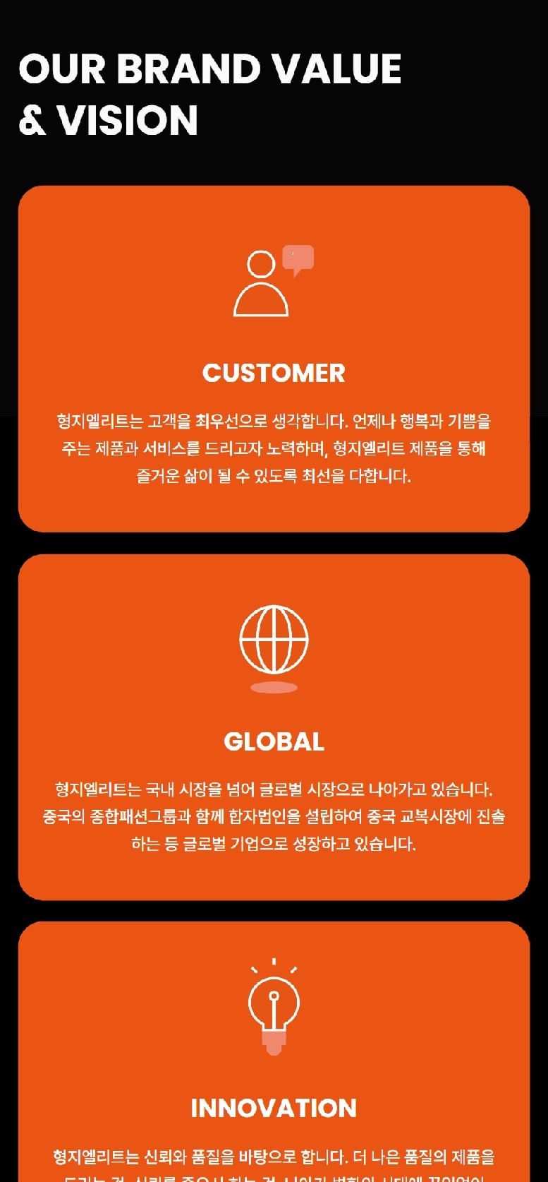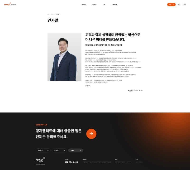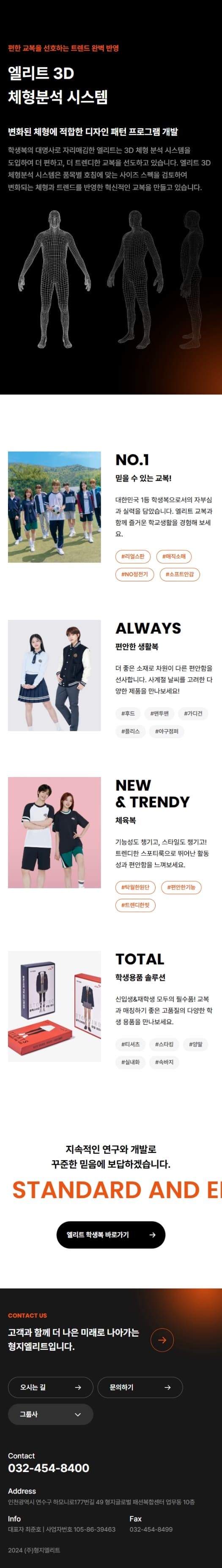 형지엘리트의 홈페이지 디자인 시스템은 오렌지와 블랙 컬러를 활용해 강렬하면서도 신뢰감을 주는