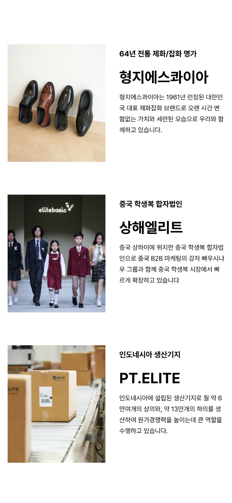 형지엘리트의 기업 정체성과 비전을 효과적으로 전달합니다.