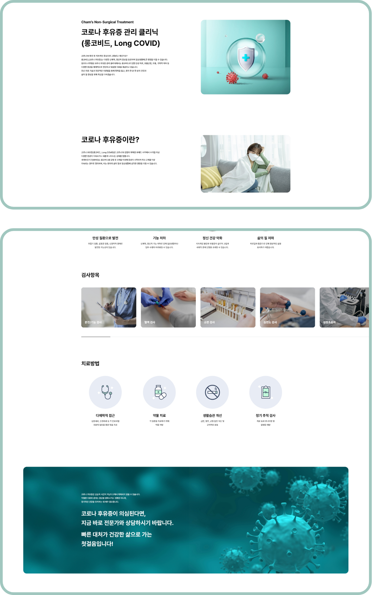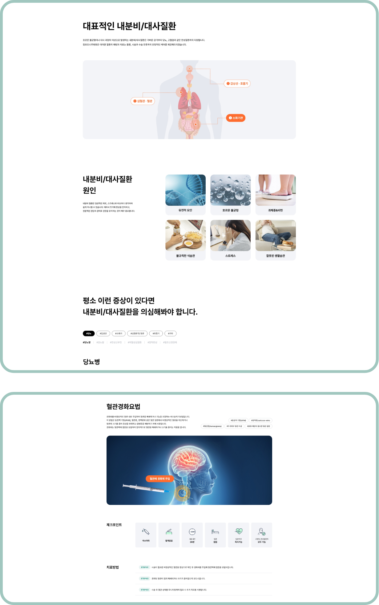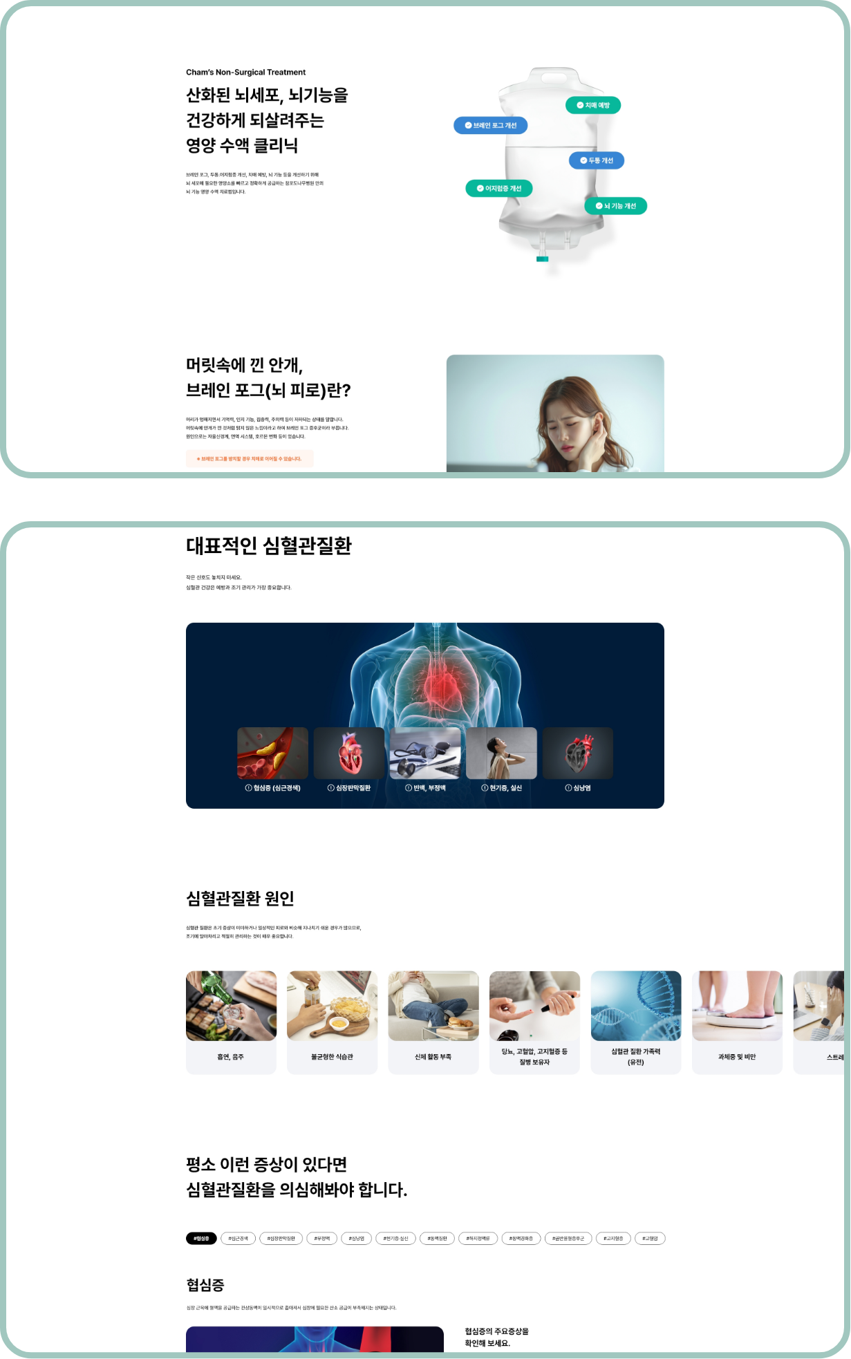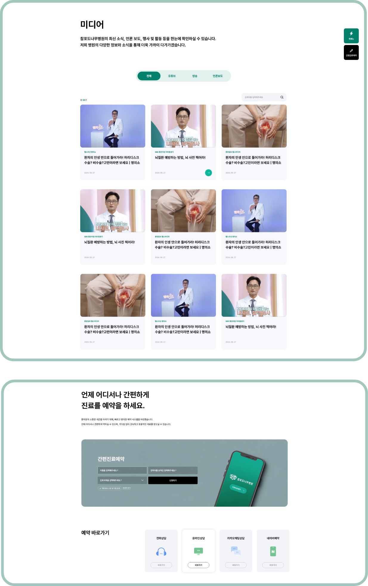 브랜드의 컬러와 타이포그래피, UI 스타일을 통합 적용하여 병원의 신뢰성과 일관된 아이덴티티를 표현하였습니다.