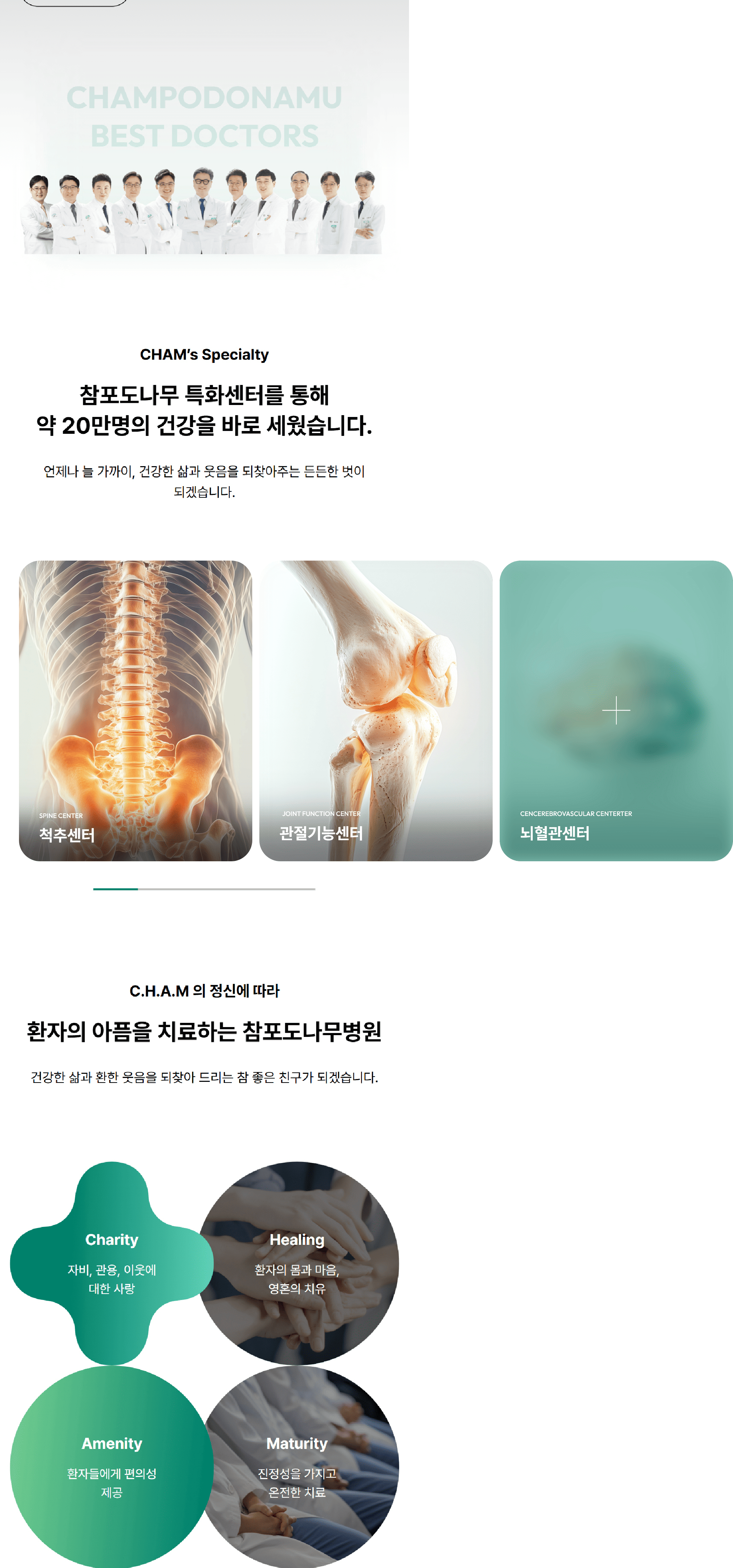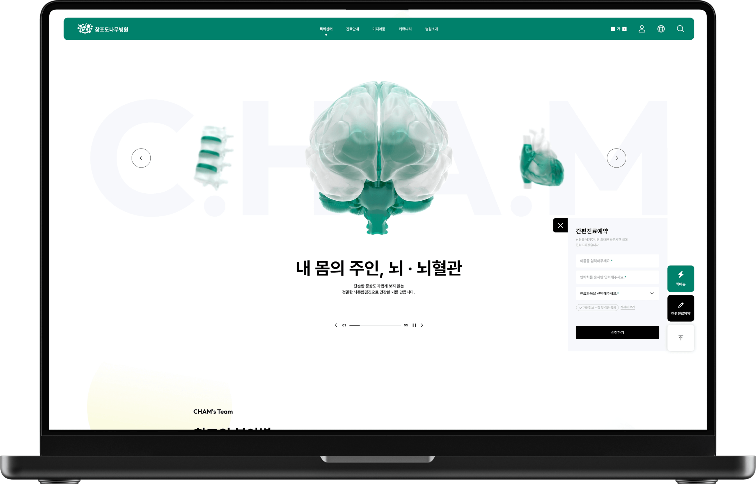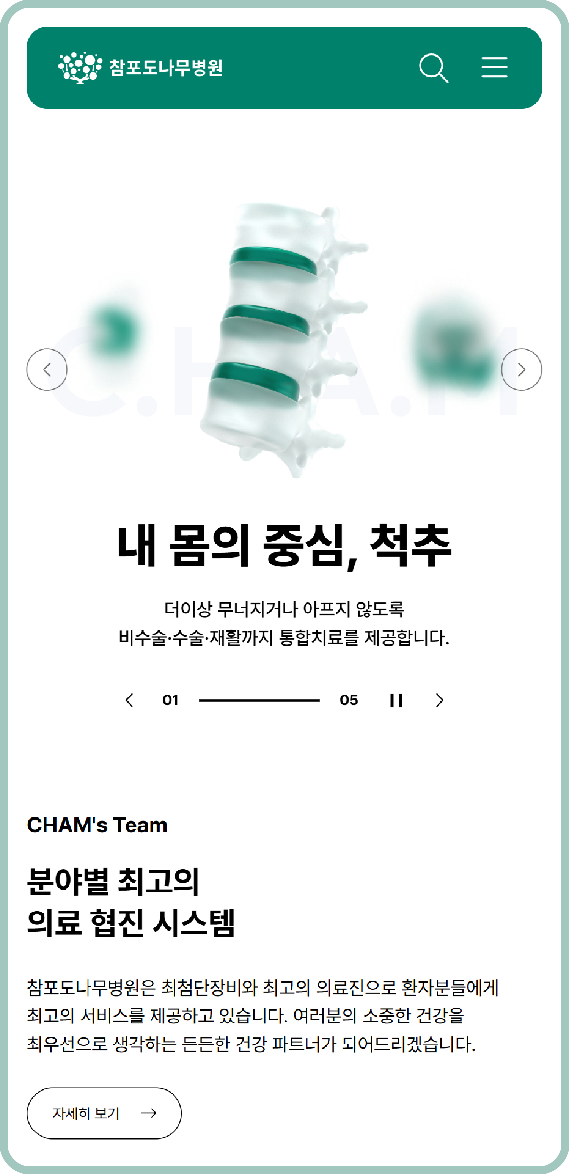 참포도나무 병원의 신뢰성과 차별화를 위해 메인 화면에 3D 그래픽을 활용하였습니다.