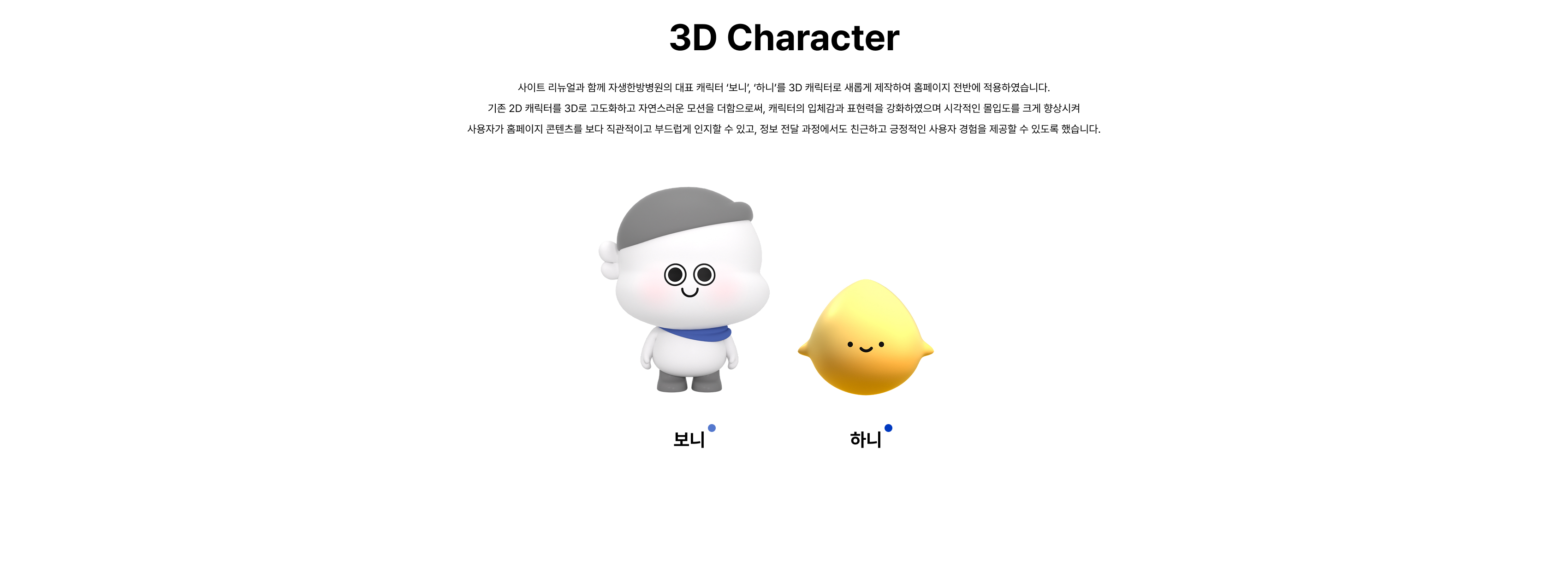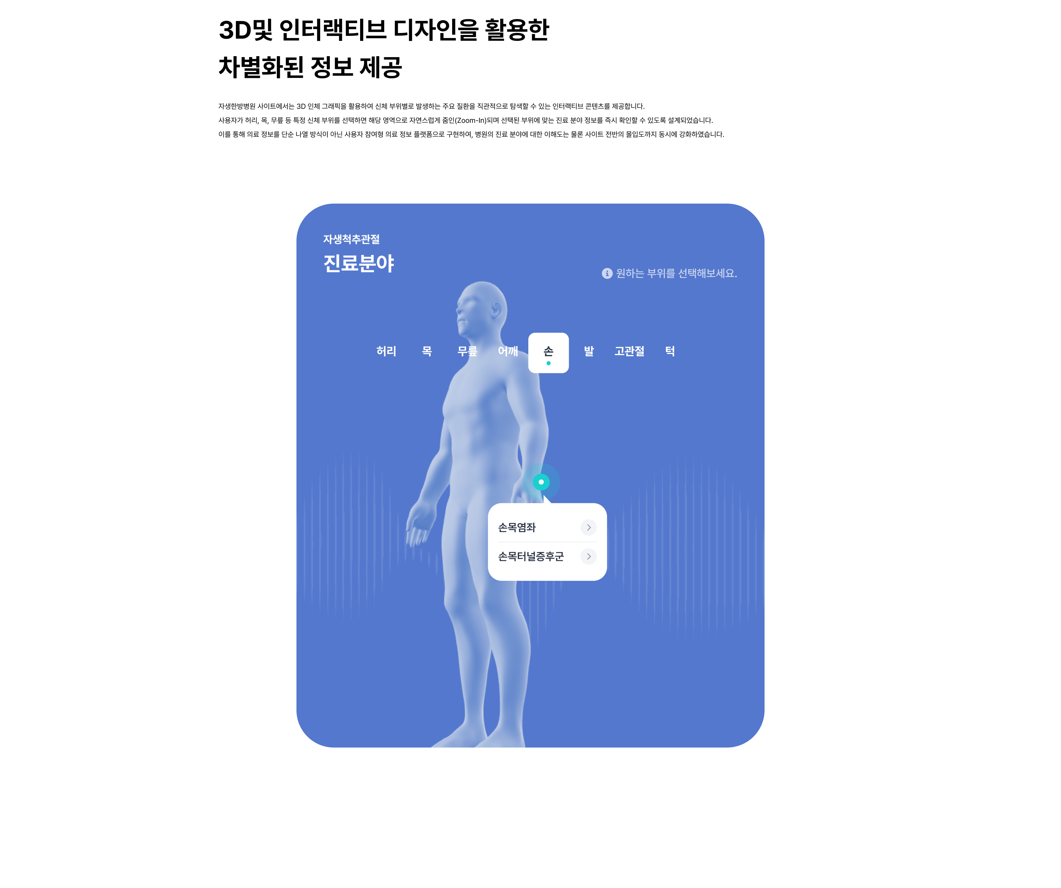 자생한방병원 홈페이지 리뉴얼은 병원의 전문적인 진료 분야를 보다 효과적으로 전달하고, 환자가 의료 정보를 쉽게 이해할 수 있는 환경을 구축하는 데 초점을 맞춰 진행되었습니다. 이를 위해 의료용 3D 디자인과 인터랙티브 구조를 중심으로 정보 전달 방식을 전면 재설계했습니다. 3D 인체 그래픽을 활용해 신체 부위별 주요 질환을 직관적으로 탐색할 수 있도록 구성하고, 각 질환 부위별로 맞춤형 3D 이미지를 제작하여 질환의 구조와 특성을 시각적으로 정확하게 전달했습니다. 이번 리뉴얼을 통해 자생한방병원 홈페이지는 병원의 진료 전문성을 시각적으로 강화하고, 환자에게는 높은 이해도와 신뢰를 제공하는 의료 정보 플랫폼으로 완성되었습니다.